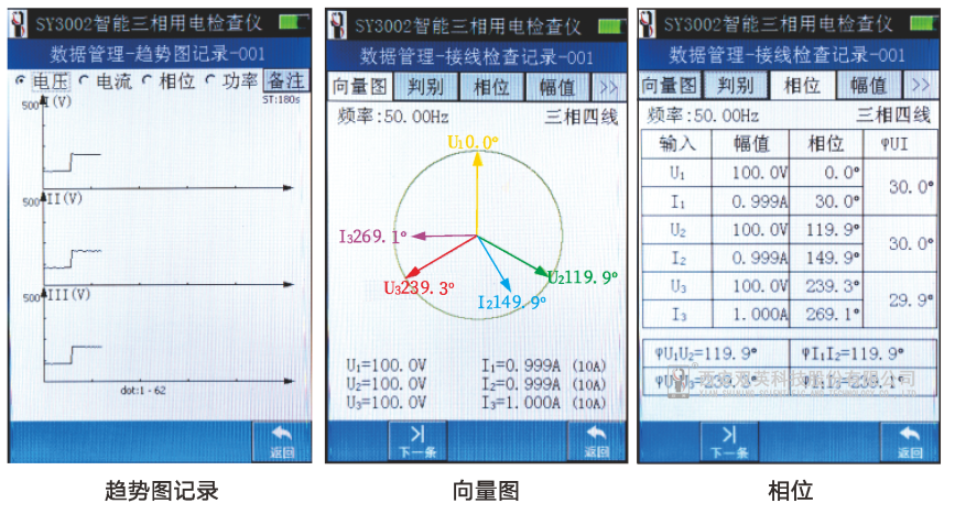 SY3002智能三相用電檢查儀:集電參數(shù)測量、電能表校驗、接線判別、CT變比測試、電能質(zhì)量分析、波形、諧波、頻譜和抄表等為一體的智能化儀表,測量結(jié)果以向量圖或者表格等方式顯示。測量范圍:0-500V、0-10A,精度:電壓0.2級,電流0.5級,相位:±1.0°,測相范圍:電流5mA-10A、電壓3V-500V