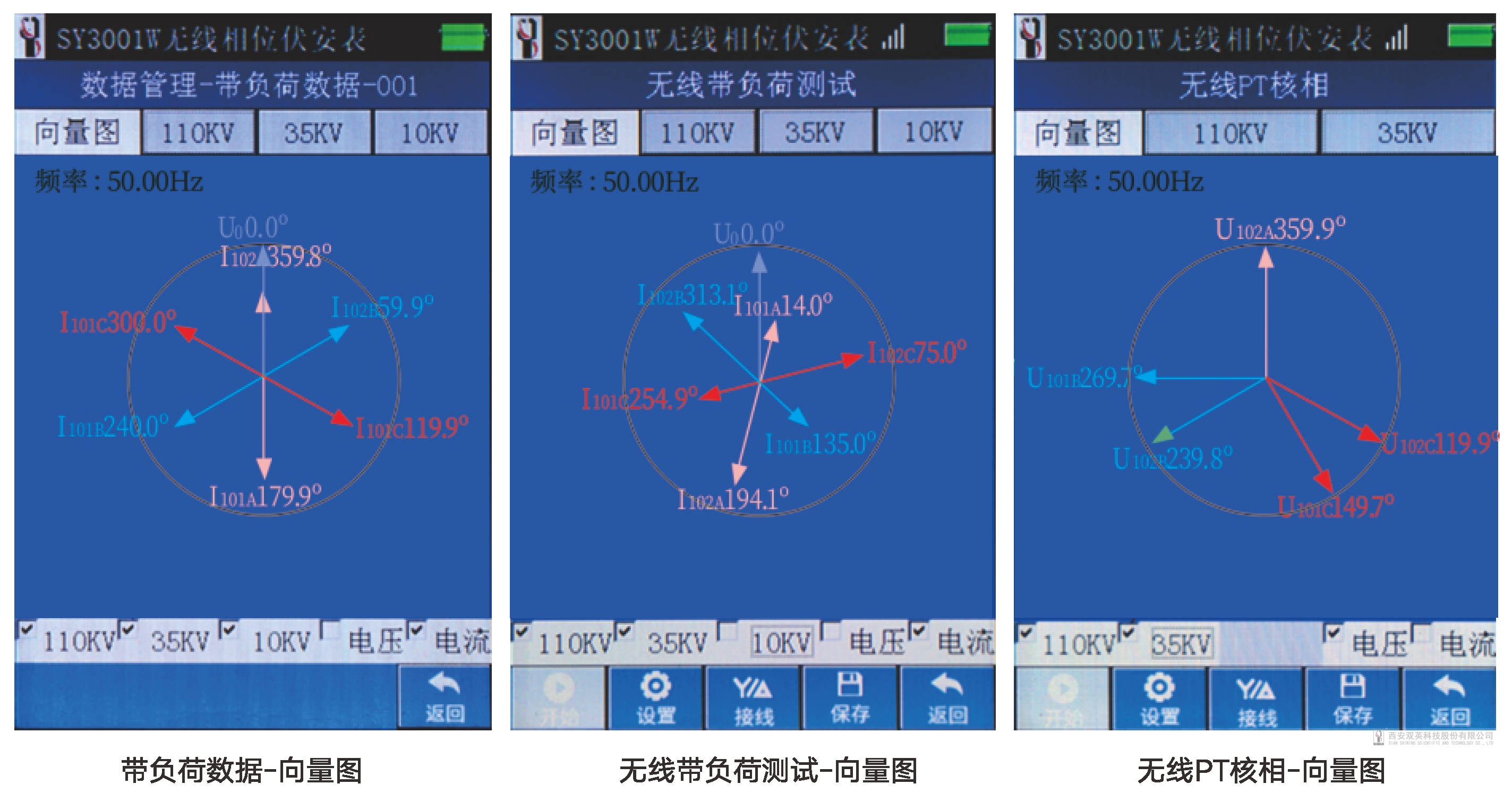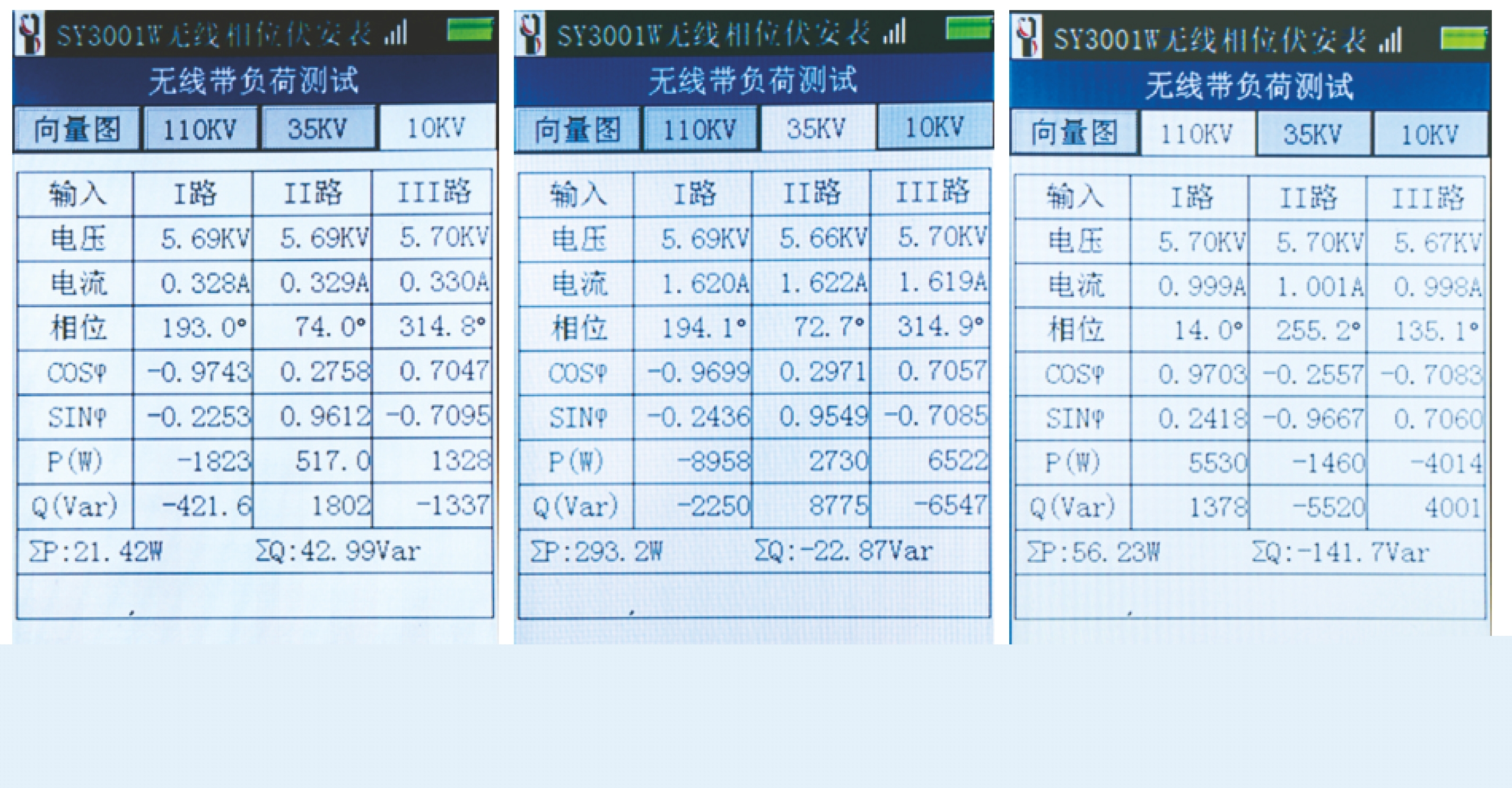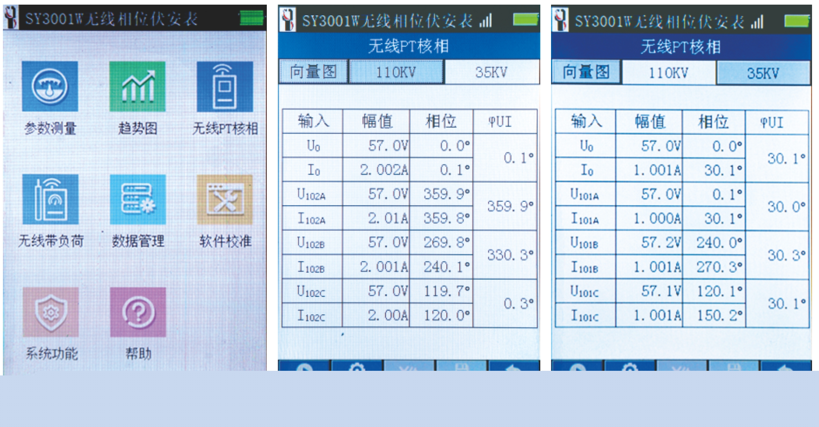 SY3001W無線相位伏安表以主機電壓或電流為基準,將高中低側結果自動保存,計算一次潮流功率及方向,多次測量結果同屏顯示;進行無線帶負荷測量或者無線PT核相。