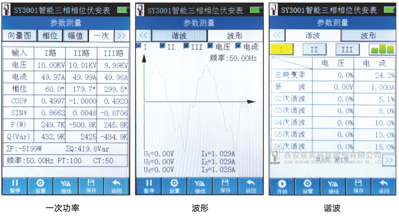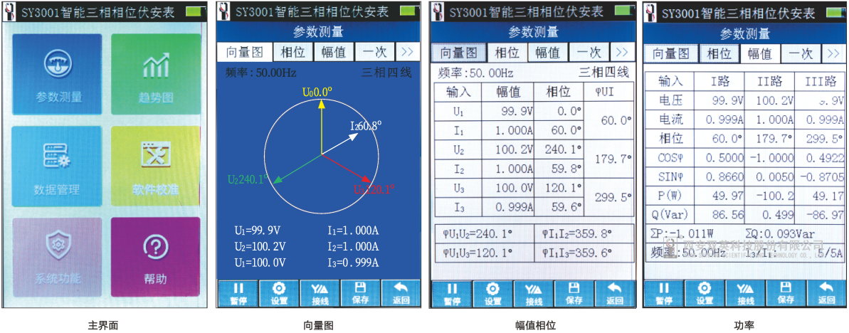 SY3001智能三相相位伏安表:可用于交流電壓、電流幅值及相位、功率、功率因數(shù)、波形、諧波和頻譜等電參數(shù)測(cè)量,并以向量圖或者表格方式等顯示,支持TF卡大容量數(shù)據(jù)存儲(chǔ),帶有藍(lán)牙和USB接口,可以連接智能手機(jī),通過(guò)手機(jī)實(shí)時(shí)顯示測(cè)量結(jié)果,并通過(guò)手機(jī)APP擴(kuò)展更多功能,可實(shí)時(shí)共享至微信或QQ好友;測(cè)量范圍:0-500V、0-10A,精度:電壓0.2級(jí),電流0.5級(jí),相位:±1.0°,測(cè)相范圍:電流5mA-10A、電壓3V-500V