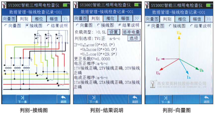 2. 真彩色TFT顯示,觸摸屏操作,可實時同屏顯示電壓和電流真有效值、相位、頻率、功率、功率因數(shù)等電參數(shù),測量結(jié)果以向量圖、幅值、相位、一次等多種方式顯示。